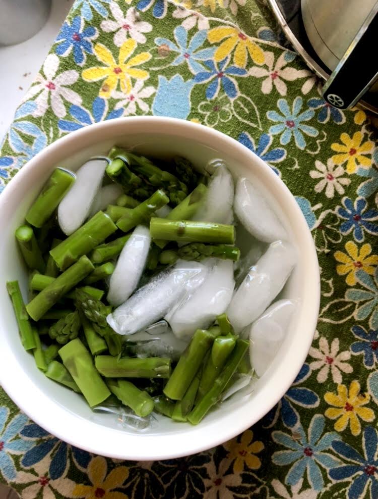 - Once asparagus is blanched add it to a bowl of ice water to stop the cooking process.