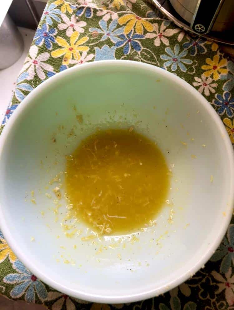 - In a separate bowl, mix the olive oil, lemon zest, lemon juice, garlic, salt and pepper.