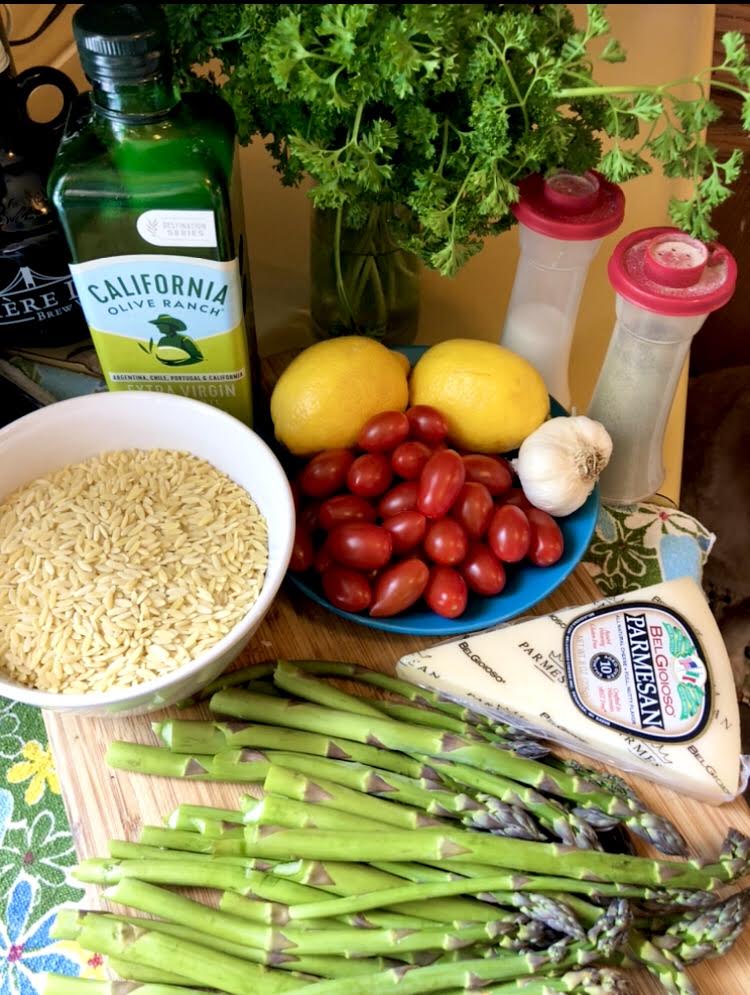 - Add the blanched asparagus and the halved tomatoes to the orzo.