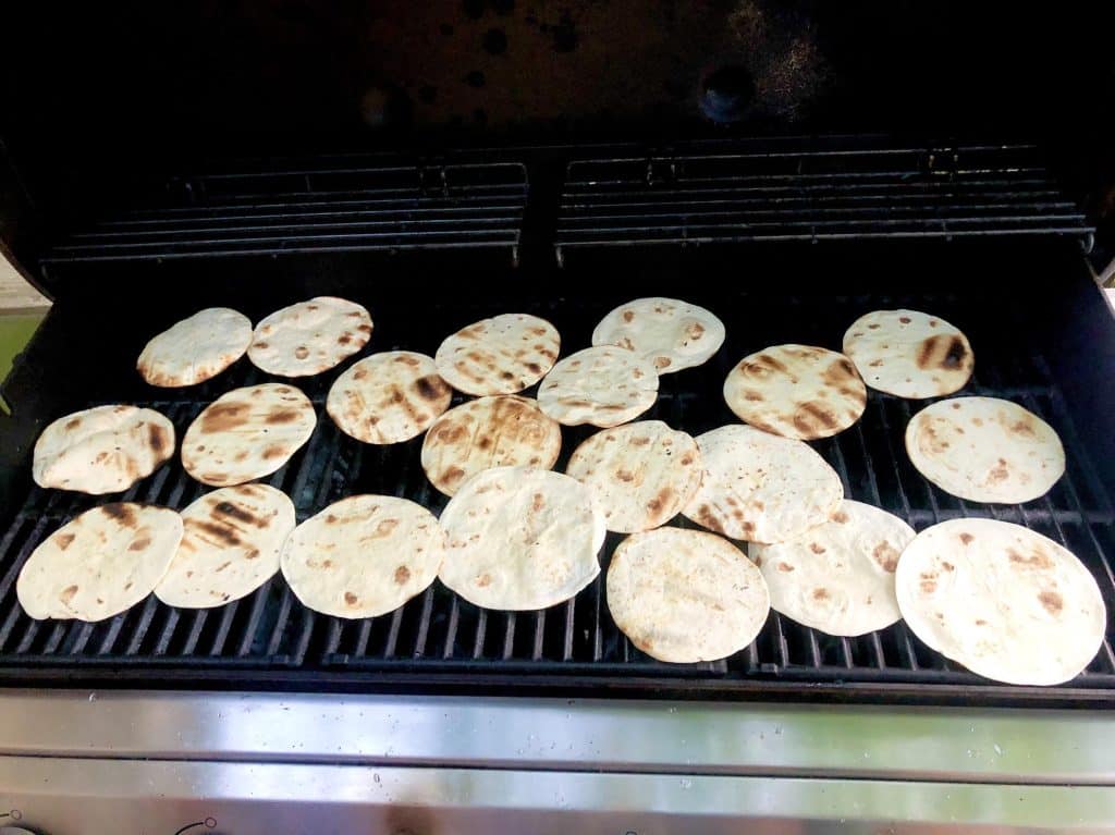- Before or after (depending on timing of marinade) grilling the shrimp, lightly oil the cook surface and grill the flour tortillas.