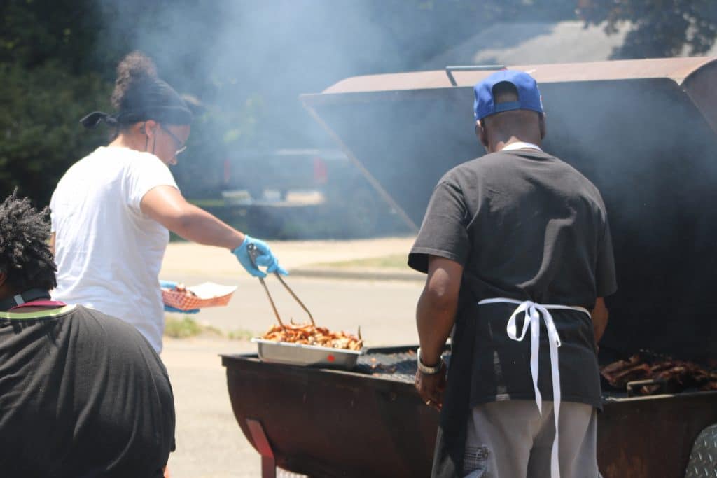 Event volunteers spaced chairs out on the lawn to accommodate social distancing, vendors set up in the parking lot, including Weenie Kings, a barbecue vendor, and Colorful Roots.