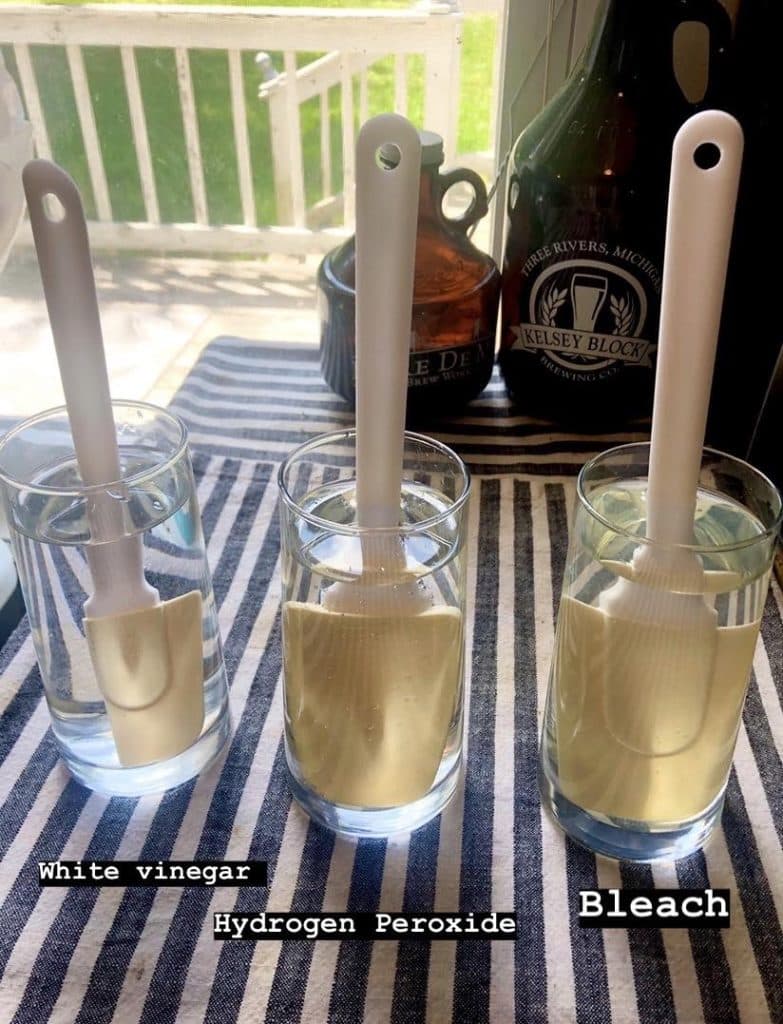 Both of the spatulas that were soaking in the hydrogen peroxide and the bleach solution were back to sparkly white by the end of the 24-hour period. The vinegar one was improved, but still not back to totally white. Just for fun—I let the vinegar spatula soak for about a week longer, and it was still not back to 100 percent white but very very close. Take a a look at my pictures below for all the results! Please make sure you wash each spatula with warm soapy water before using them to cook with.
