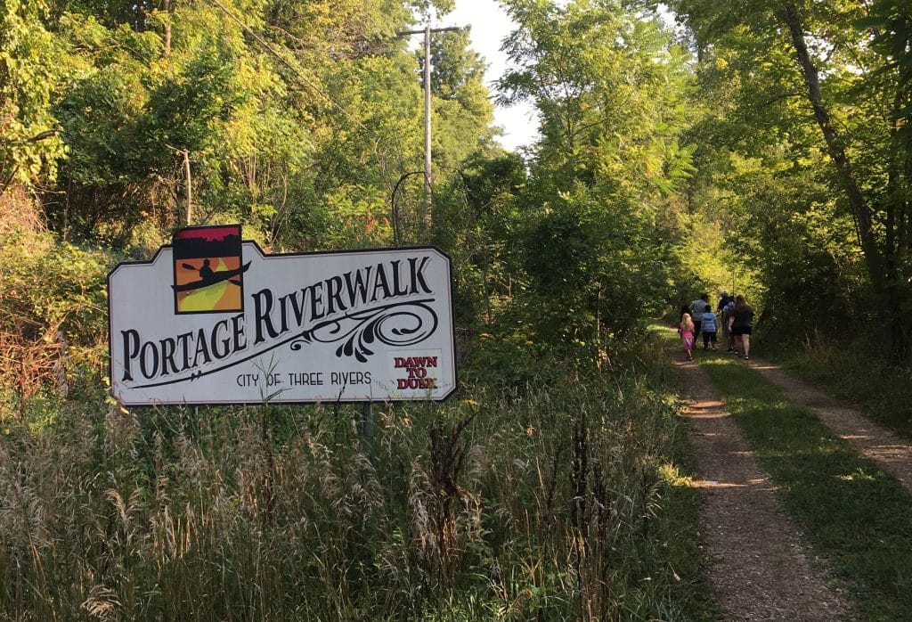 Arrows placed on the sidewalk using different colored masking tape marked the routes of the various trails. The Portage Riverwalk, which the City of Three Rivers began developing a few years ago, is the newest trail. There is also the 4.6-mile Broadway-Hoffman trail and the 2.2-mile South Main Trail, both of which also cross all three of the city’s rivers. The 1.5-mile Memory Isle trail is the shortest. It crosses the Rocky and Portage Rivers and features the recently replaced Memory Isle foot bridge.