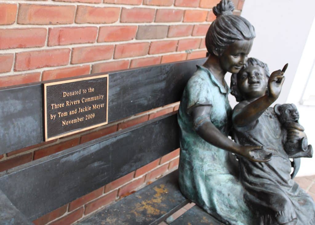 Abench sculpture that has been a fixture in downtown Three Rivers for over a decade now has a new home at the Three Rivers Public Library (TRPL). The sculpture, which depicts a mother and child reading on a slatted bench, was presented to the library in a Wednesday ceremony. It was first donated in late 2009 during the completion of the East Alley, which connects the historic downtown storefronts to the parking lots on Joshua Drive.