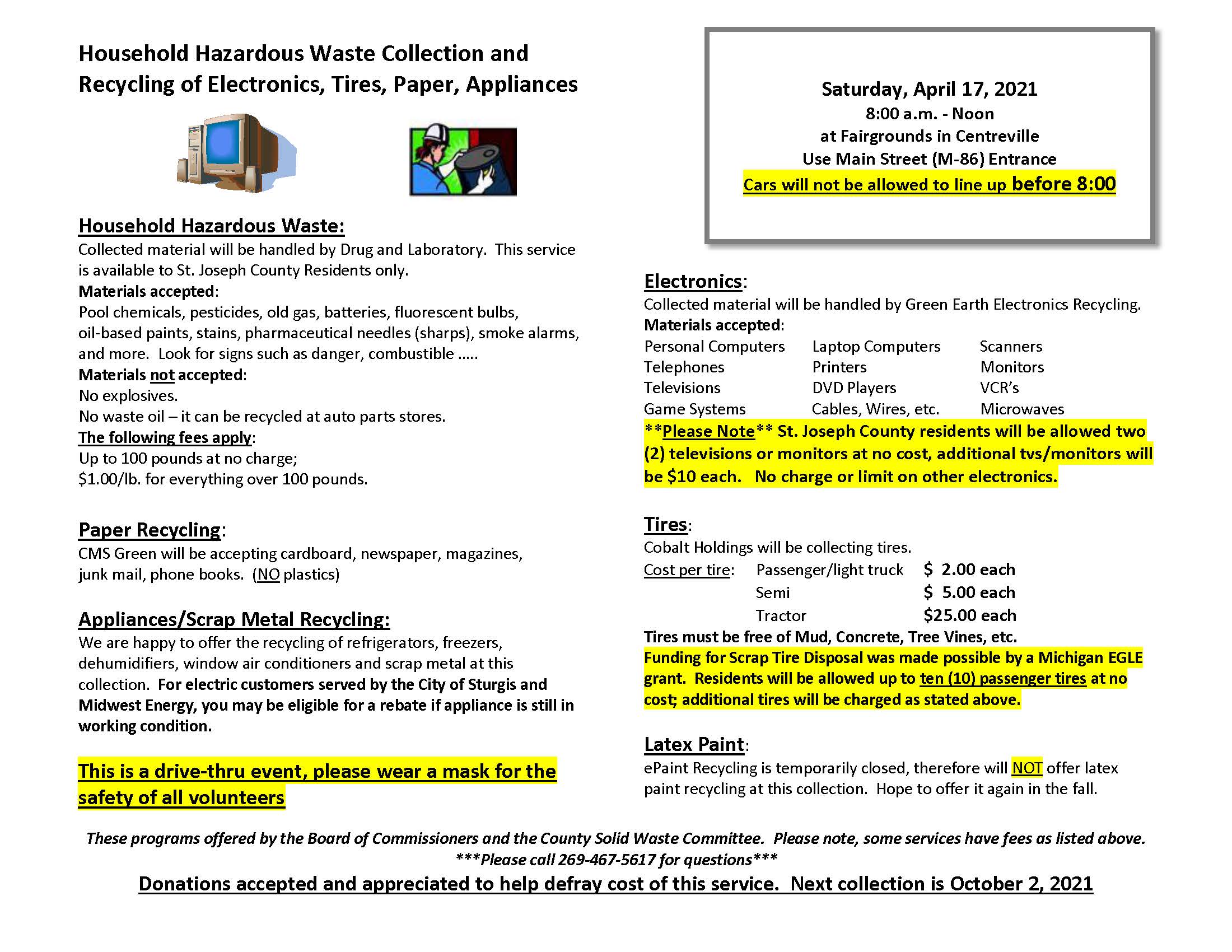The program is offered by the St. Joseph County Board of Commissioners and the County Solid Waste Committee. Those with questions are encouraged to call (269) 467-5617 for further information. Donations are accepted and appreciated to help “defray the cost of this service.” The next collection day will be October 2, 2021.