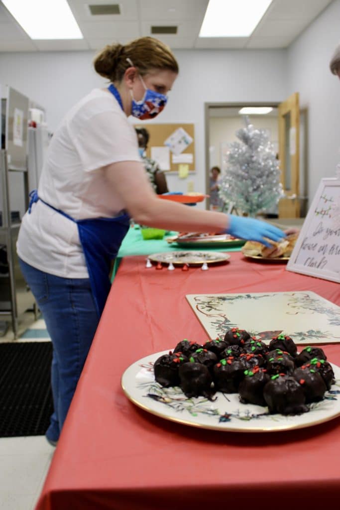 Several members are working in the kitchen preparing lunch, each at their own station, gloved and hair tucked up in hair nets. “Chopping!” Travis calls out, a cutting board in front of him with neatly diced and sliced onions. “Making pizza,” Berta adds, pressing dough out on a pan. Their joy in their jobs is evident.