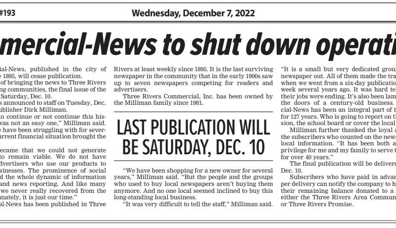 “The Three Rivers Commercial-News was a fixture in this community for 127 years. It preserved the town’s history, and provided vital information for its readers across parts of three centuries. It was the old guard, a publication that withstood so much, and meant even more to the people it served.”