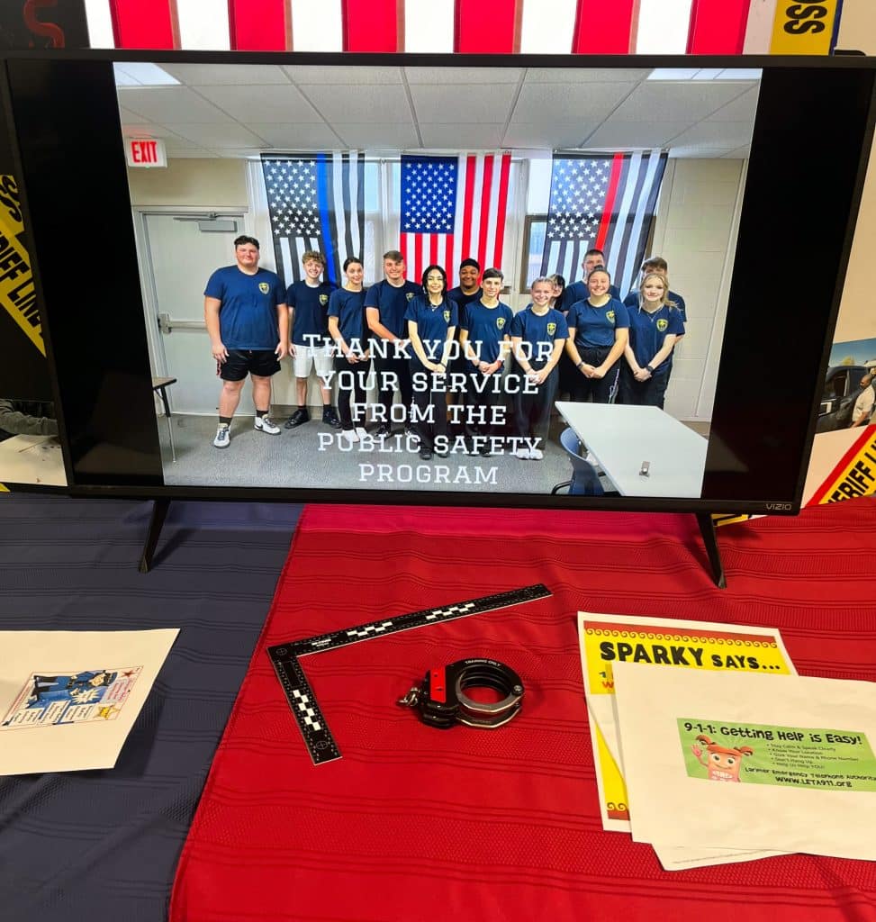 This is the inaugural year for the CTE public safety course, with Spence saying it was a “no-brainer” when he was approached to consider teaching. “We are building this from the ground up,” he said, calling his students “pioneers.” The public safety class worked together with the CTE marketing class to develop a design for the program, which honors police, firefighters, and emergency medical services, as well as signifying the county. Spence said of the logo, “I tell them they can’t take this away from you. Nobody can. You’re the first ones to do this.”