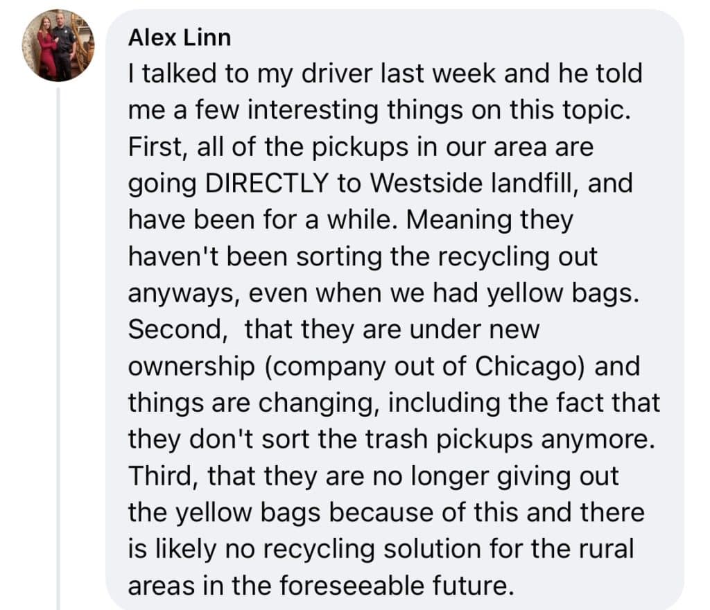 “I talked to my driver last week, and he told me a few interesting things on this topic. First, all of the pickups in our area are going DIRECTLY to Westside landfill, and have been for a while. Meaning they haven’t been sorting the recycling out anyways, even when we had yellow bags. Second, that they are under new ownership and things are changing, including the fact that they don’t sort the trash pickups anymore. Third, they are no longer giving out the yellow bags because of this, and there is likely no recycling solution for the rural areas in the foreseeable future.”