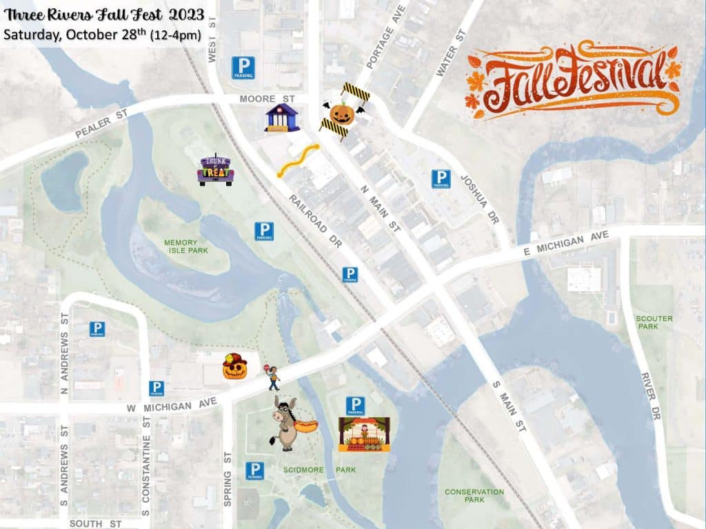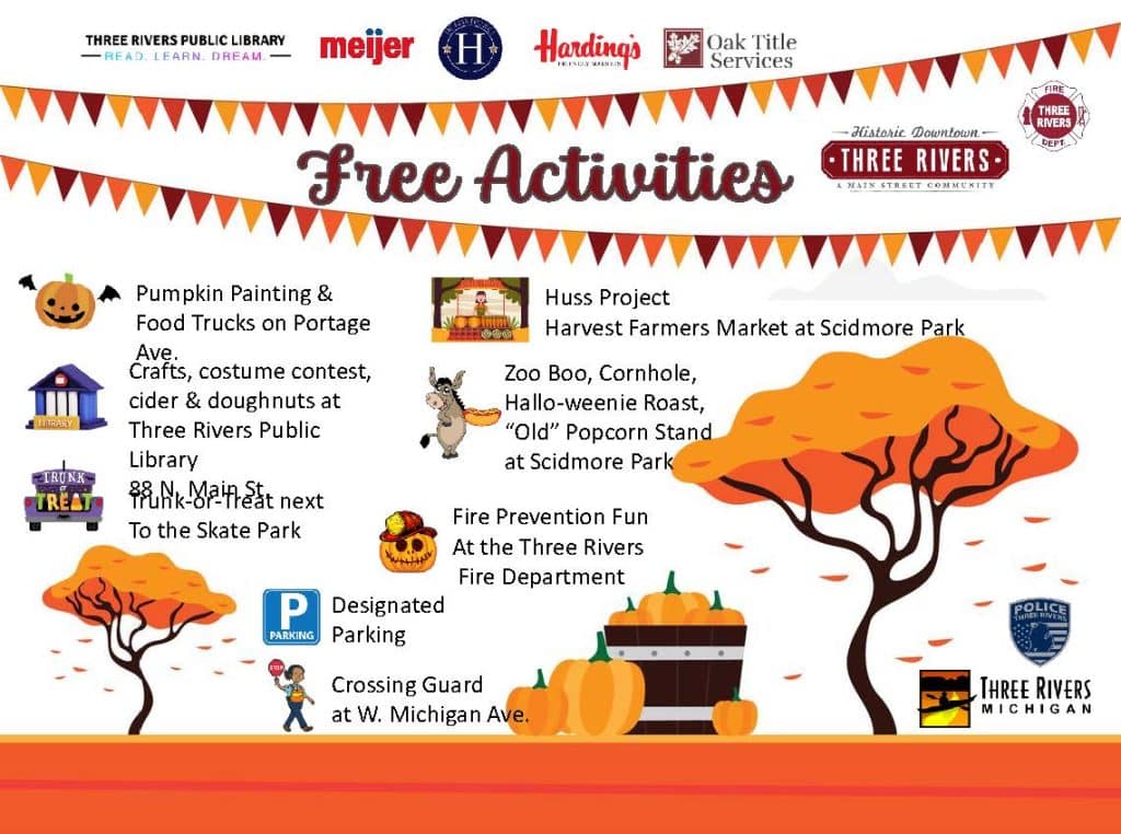 See the list of free activities and a map of where to find them at the first annual Fall Festival in Three Rivers on Saturday, October 28.