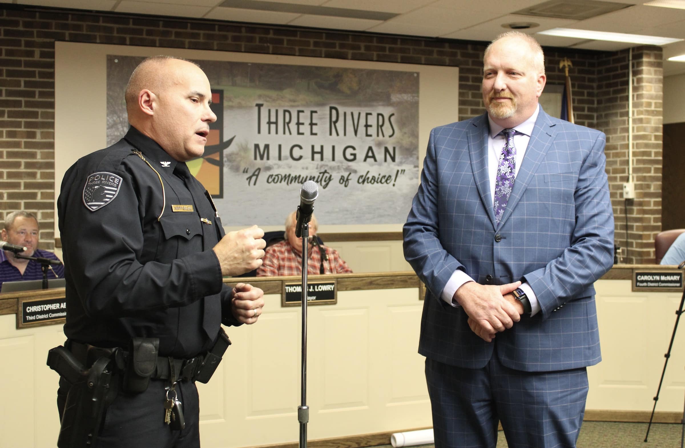 At a standing-room only meeting on Tuesday night, the Three Rivers City Commission heard comments from numerous citizens on the quality and cost of the city’s water supply. Deputy Police Chief Sam Smallcombe was also acknowledged for a recent promotion and 21 years of service to Three Rivers.