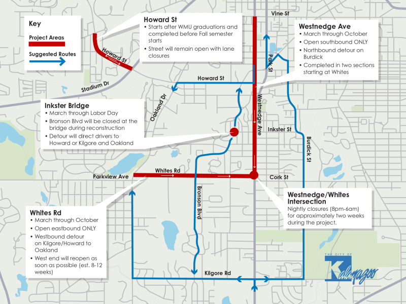 The Kalamazoo project is expected to take place from March to October, during which time Westnedge Avenue will be open southbound only, with a detour for northbound drivers via Burdick Street.