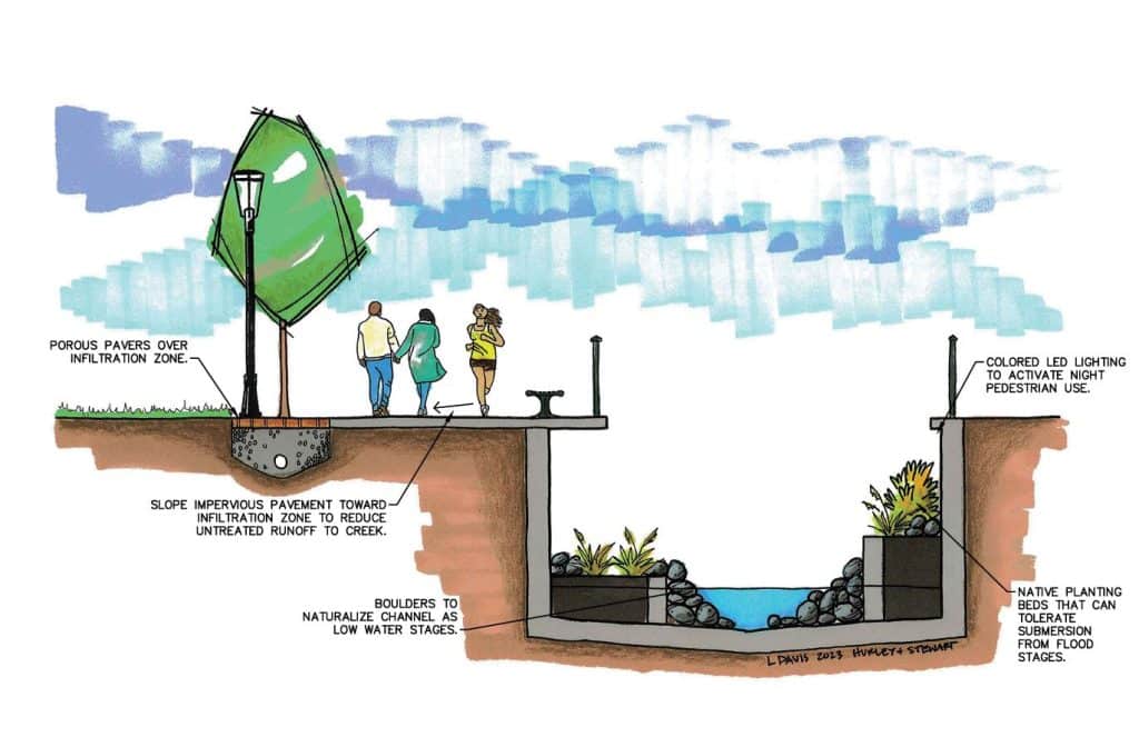 The city says much of the creek is underground and the infrastructure that it flows through dates back to the 1880s in some areas. The new creek design will uncover more sections of the creek and improve the quality of the water and the environment.