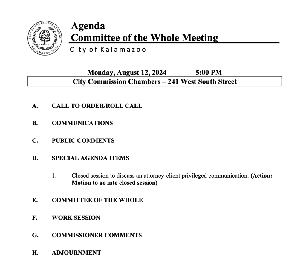 The Committee of the Whole meeting is expected to be held in closed session. It concerns privileged communication between an attorney and client.​ The regular business meeting may also include a closed session portion.