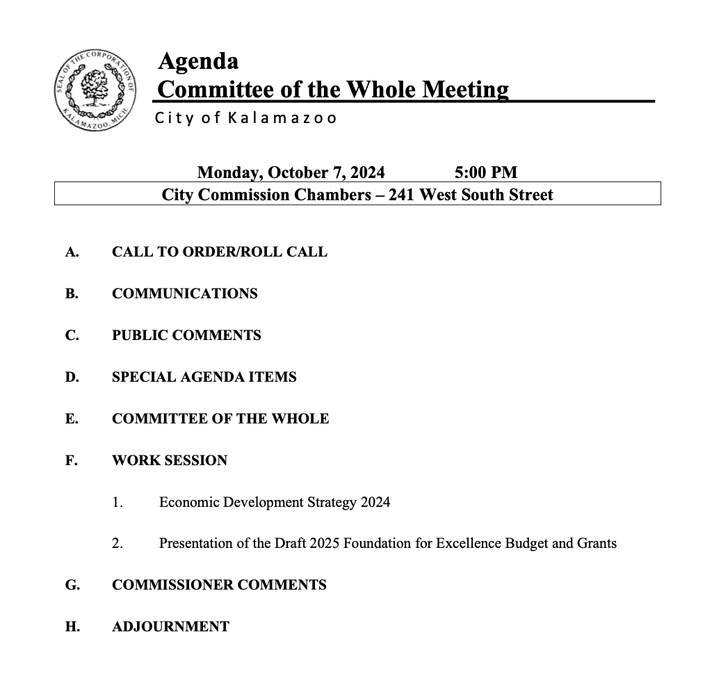 The meeting begins at 5 p.m. with a Committee of the Whole meeting, featuring discussions on Kalamazoo’s 2024 economic development strategy and the draft 2025 Foundation for Excellence budget and related grants, followed by a regular business meeting at 7 p.m.