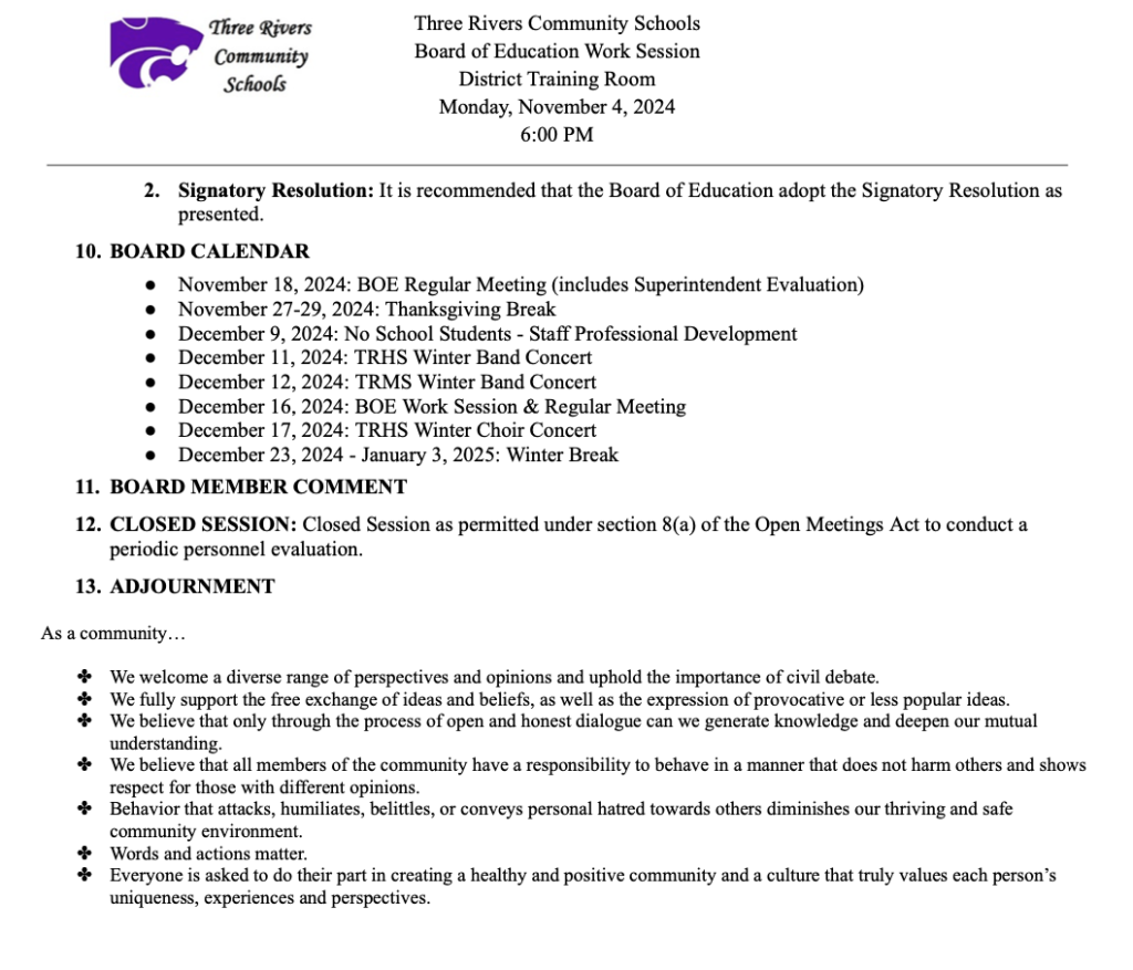 Local meeting primer: Three Rivers Community Schools Board of Education