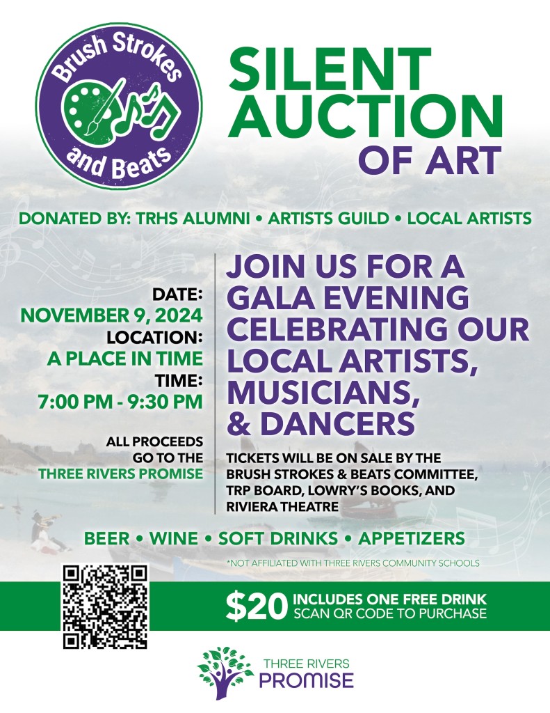 A $20 ticket includes one free drink. Appetizers will be served during the event by the Three Rivers Woman’s Club. Tickets can be purchased from members of the event committee or the Three Rivers Promise board, or at Lowry’s Books and the Riviera Theatre & Bar in downtown Three Rivers.