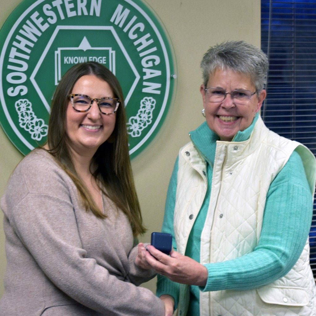 Emily Schrock, alumni relations and development coordinator, received a five-year service pin. Before studying business administration at SMC, Schrock was valedictorian at Constantine. As a student, she worked in the admissions office for her 2016 associate degree. Schrock worked as SMC’s admissions communications specialist while completing her education at Ferris State University, earning a bachelor’s degree in digital marketing in 2018.