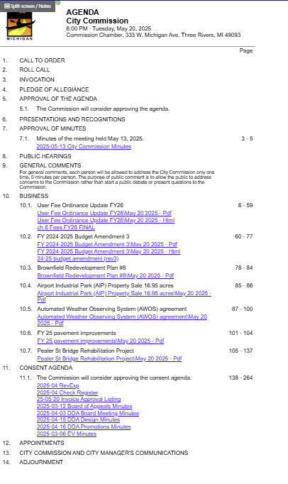 The Three Rivers City Commission will meet on Tuesday, May 20, at City Hall to consider a range of business matters, including updates to user fees, a budget amendment, and the sale of nearly 17 acres in the Airport Industrial Park.