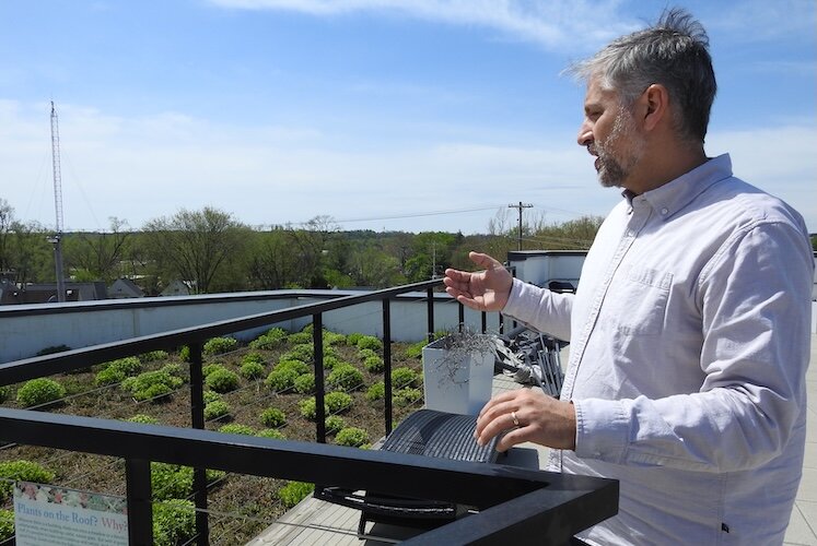 In addition to a rooftop rain garden, a drain system funnels rainwater to planters around the building, where climbing plants grow up trellises. Targeted redirection of rainwater is important in that part of town, Hollander says, with the neighborhood half a block to the west situated in a 100-year floodplain and susceptible to bad flooding.