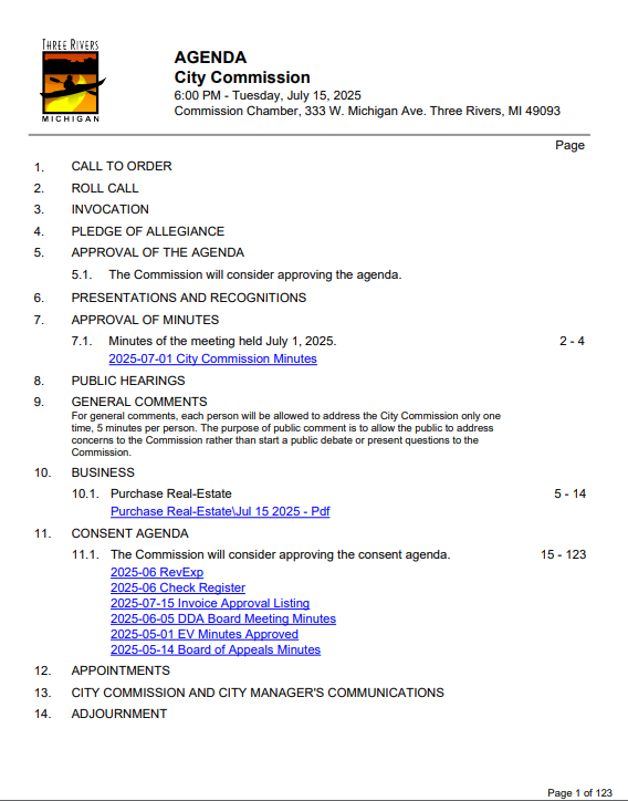 The Three Rivers City Commission is scheduled to meet Tuesday, July 15 at 6 p.m. at city hall with very little to consider in terms of action items.
