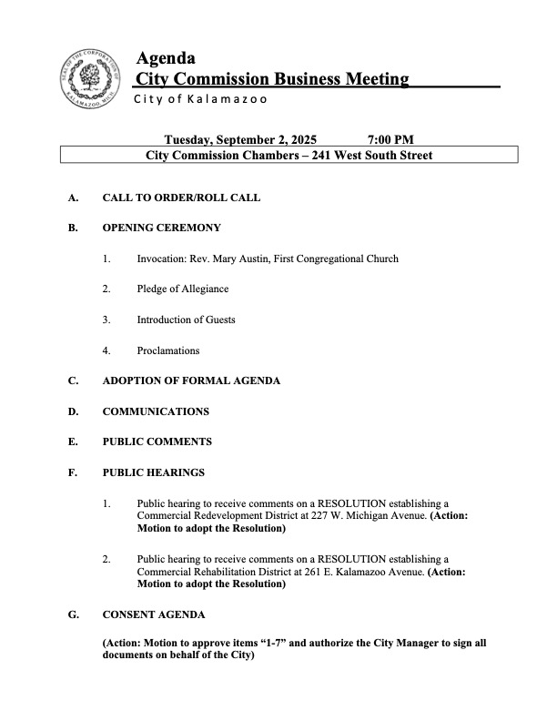 This evening at 7 p.m., the Kalamazoo City Commission will meet to hold public hearings on establishing a Commercial Redevelopment District at 227 W. Michigan Ave. and a Commercial Rehabilitation District at 261 E. Kalamazoo Ave. Commissioners will also consider more than $33 million in water and wastewater system financing and vote on a contract for a new diversity, equity, and inclusion (DEI) assessment.