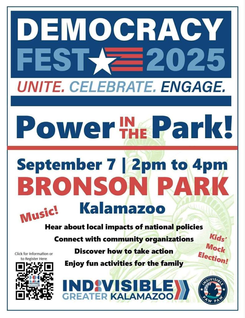 The event, themed “Power in the Park!”, is organized by Indivisible Greater Kalamazoo and Paw Paw Indivisible — two local chapters of the national Indivisible.org network. Lead organizer Ken Greschak said the festival is a direct response to “efforts to dismantle our nation’s democratic institutions and to defund critical federal programs and services.”