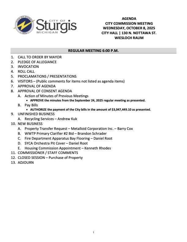 Sturgis City Commission will meet for its regular business meeting on Wednesday, October 8 at 6 p.m. at 130 N. Nottowa St.