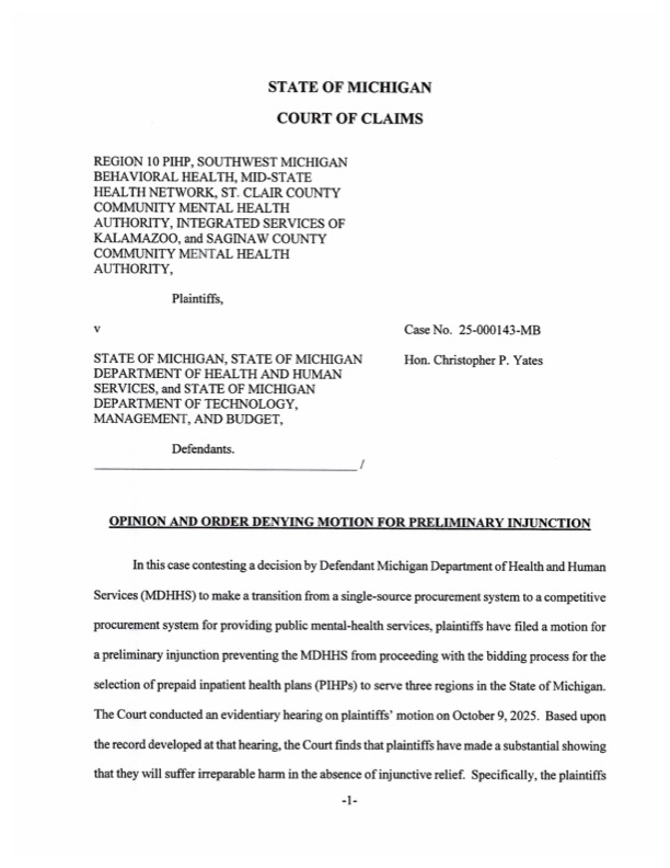 The plaintiffs challenged a 2025 Request for Proposals (RFP) that consolidates the current 10 PIHPs, which oversee publicly funded behavioral-health services through Medicaid, into three larger regions. They argued that the process effectively bars existing regional entities from competing for contracts and violates provisions of the state Mental Health Code (MCL 330.1204b).