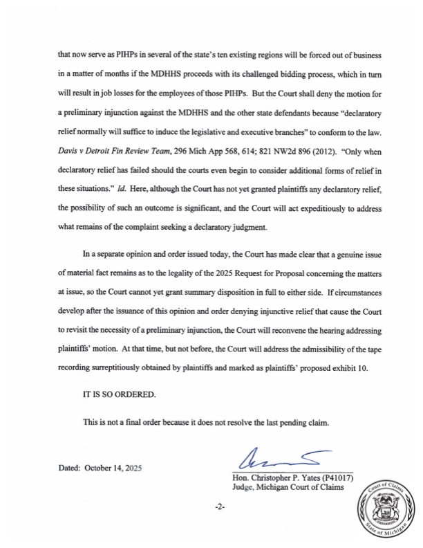 Yates acknowledged that concern, calling the state’s approach “unwise given the history of those existing PIHPs with the program and their strong connections with CMHSPs and providers.” But he emphasized that questions about the wisdom of policy decisions belong to MDHHS and the Legislature, not the courts.