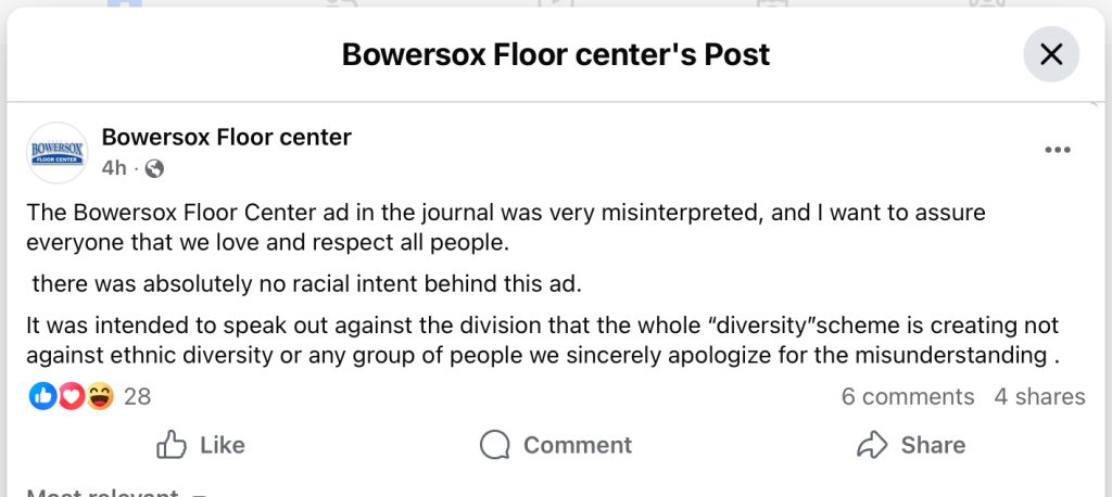 In both statements, the business said the ad was “misinterpreted” and that there was “no racial intent,” arguing it was meant to warn against “division” rather than promote discrimination.