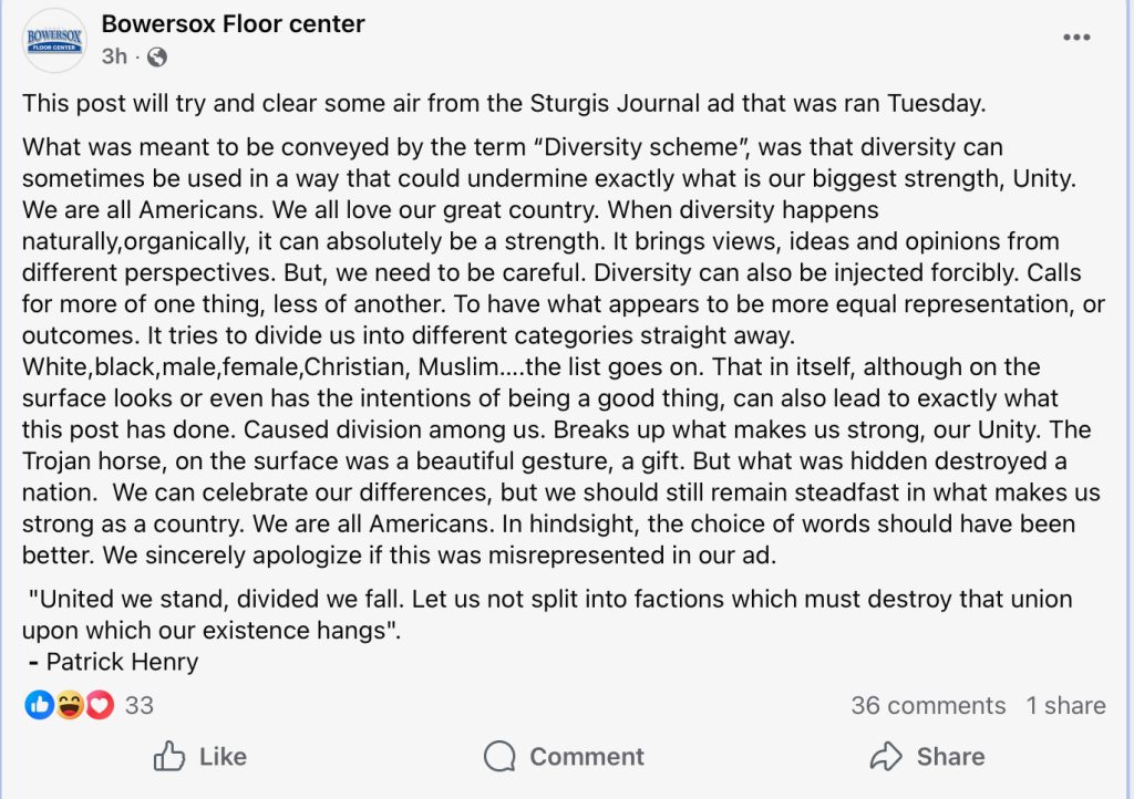 An ad that ran Tuesday in the Sturgis Journal from Bowersox Floor Center stated, “Diversity is the Trojan horse of terrorism,” drawing swift criticism from readers who called the message racist and harmful.