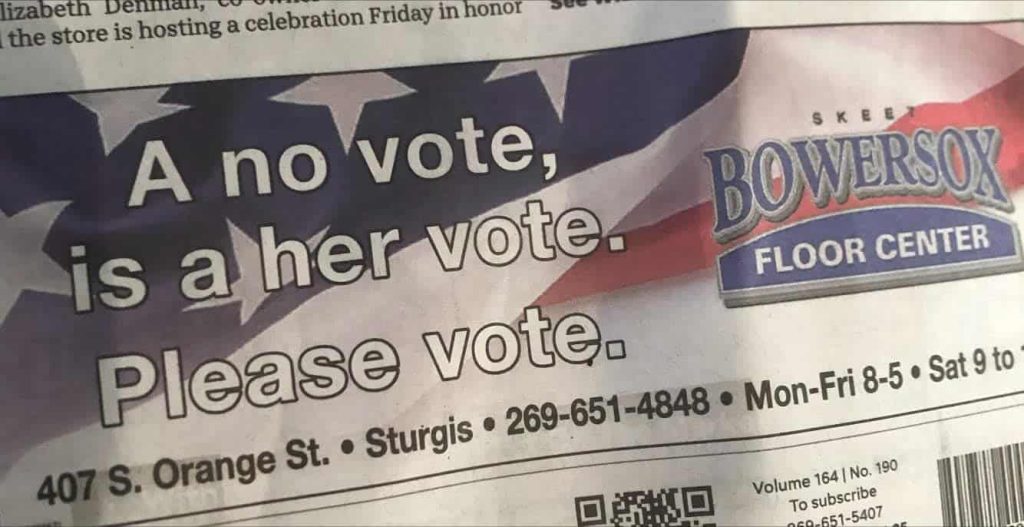 Tuesday’s ad also prompted questions about the Sturgis Journal’s advertising review process. Watershed Voice reached out to Journal editor Brandon Watson on Wednesday but had not received a response as of publication.