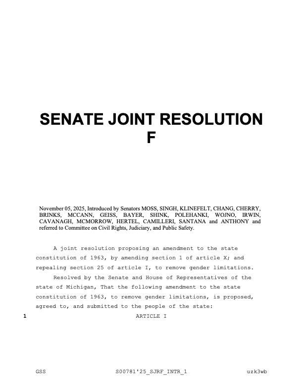 Because the Michigan Constitution can only be amended through a voter-approved ballot measure, SJR F must first secure a two-thirds majority in both legislative chambers. In the Senate, that means 25 votes. Democrats hold 19 seats, and Moss said all have co-sponsored the resolution, leaving six Republican votes needed for passage.