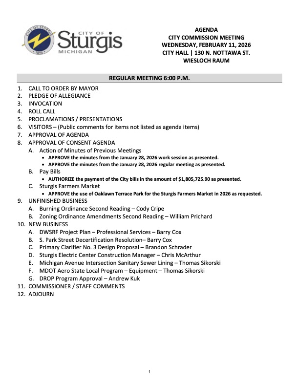 The Sturgis City Commission will meet this Wednesday, February 11, at 6 p.m. at Sturgis City Hall. Commissioners will revisit two proposed ordinance changes from their last meeting—burning regulations and promotional display rules—and consider several new business items, including a Drinking Water State Revolving Loan Fund (DWSRF) project plan related to lead service line replacement, hiring a construction manager for the Sturgis Electric Center project, and the decertification of a portion of S. Park Street.