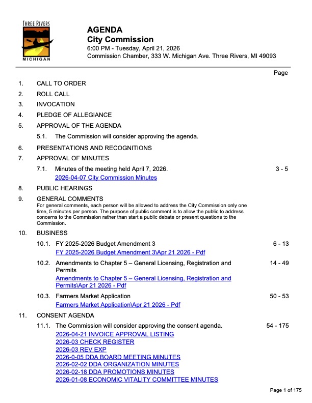 The Three Rivers City Commission will meet Tuesday, April 21, at 6 p.m. in City Hall for a regular business meeting. Commissioners will have the opportunity to give input on a proposed second farmers market in Three Rivers that city staff rejected, consider amendments to city code removing inflammatory language characterizing massage therapists as sex workers and labeling homosexual behavior as “deviant,” and review a series of budget amendments reflecting differences between projected and actual revenues and expenditures.